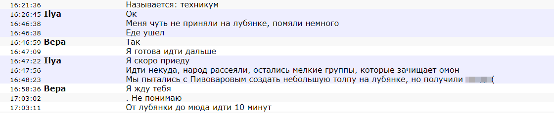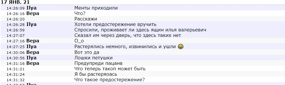 Из этой же переписки выясняется, что пользователь Ilya ввёл в заблуждение сотрудников полиции, пришедших к нему домой с предостережением от участия в несогласованных акциях.