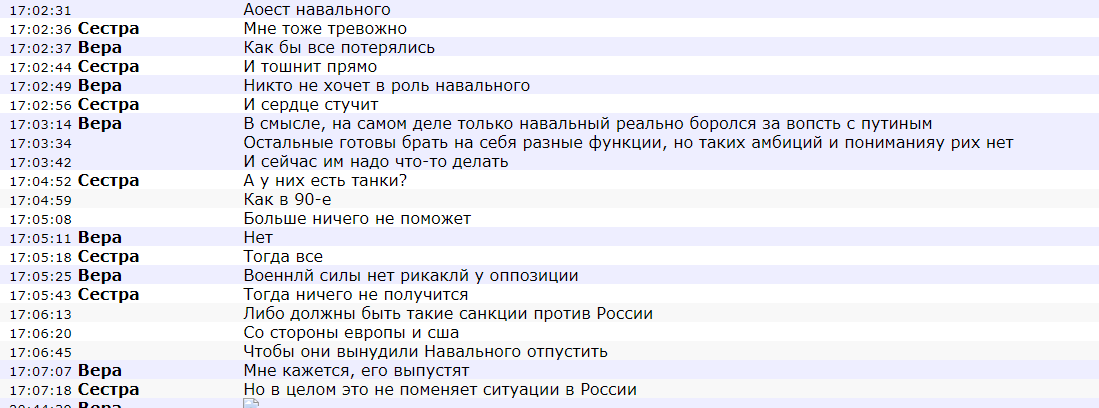 Никто не желает разделить участь Навального, жалуется Вера на арест оппозиционера пользователю под ником Сестра (предположительно, Зарине Мусаелян) в онлайн-переписке, датированной 3 февраля 2021 года. Помогут только танки, решают собеседницы, либо санкции со стороны Европы и США.