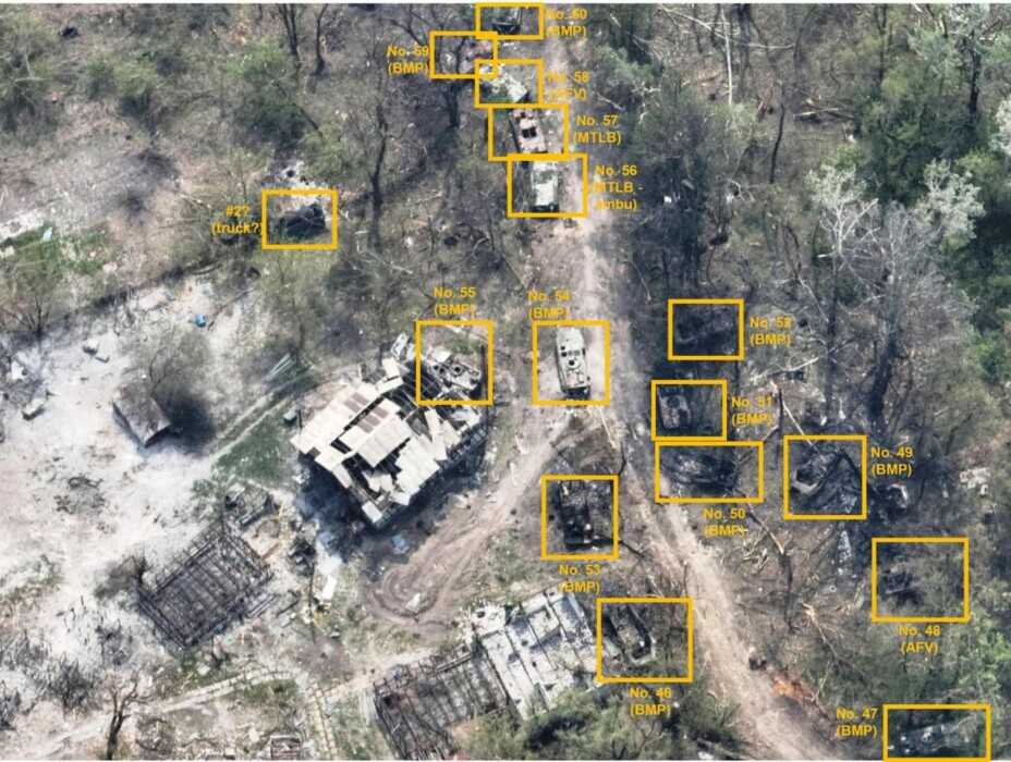 Уничтоженная российская техника в районе понтонной переправы в результате неудачного прорыва.Подробнее про ситуацию на Северском Донце можно почитать по ссылкам: здесь и здесь.