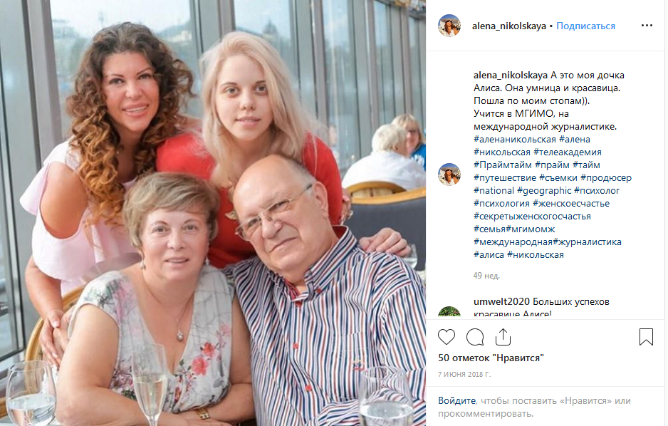 Алена родилась в Москве в удивительный день — 8 июля, когда отмечается праздник День семьи, любви и верности. Ее родители — люди образованные и интеллигентные: отец — профессор, а мама до ухода на пенсию была ведущим стоматологом столицы. Пациенты ее обожали, из-за чего попасть к ней на прием было очень трудно. Но и сейчас ее 73-летняя мама активно трудится: она занимается Су-Джок-терапией – акупунктурой (иглоукалыванием), благодаря чему на ее счету немало благодарностей от излечившихся пациентов.