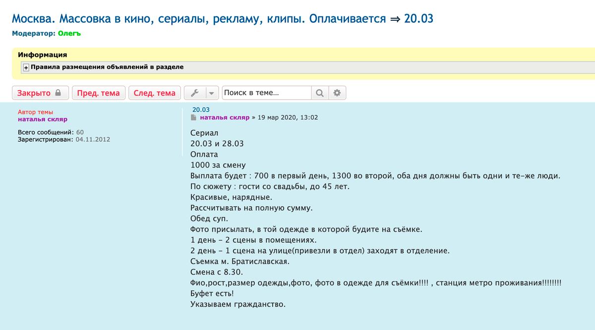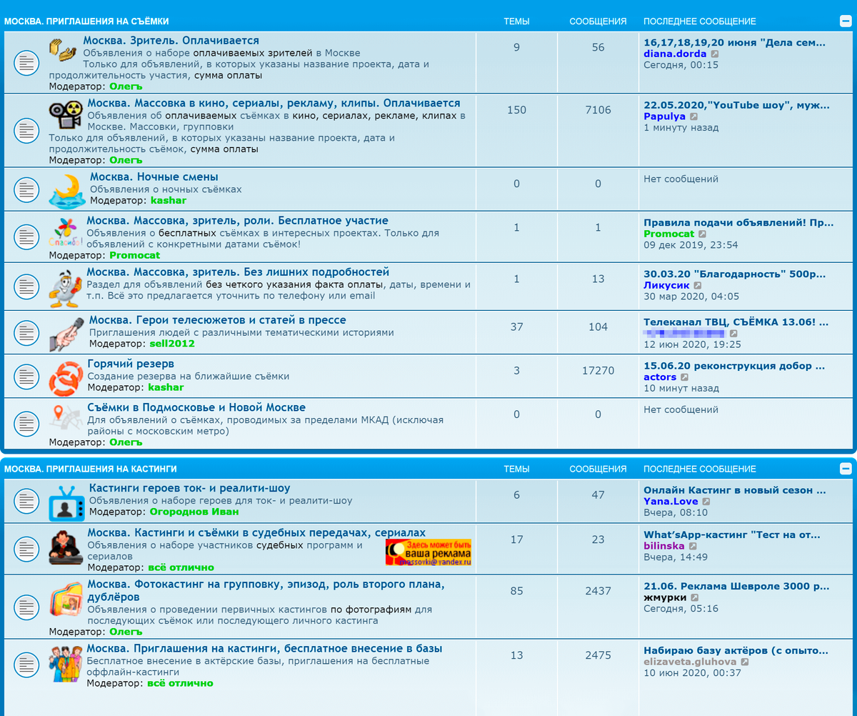 На мой взгляд, одна из самых больших баз данных — форум massovki.net. Там постоянно появляются новые объявления о поиске людей. Разделы самые разные. Набирают массовку в кино и сериалы, зрителей на телепередачи, ищут героев с интересными историями для телешоу. В основном ищут людей в Москве, но есть ветки про киносъемки в Санкт-Петербурге и регионах.