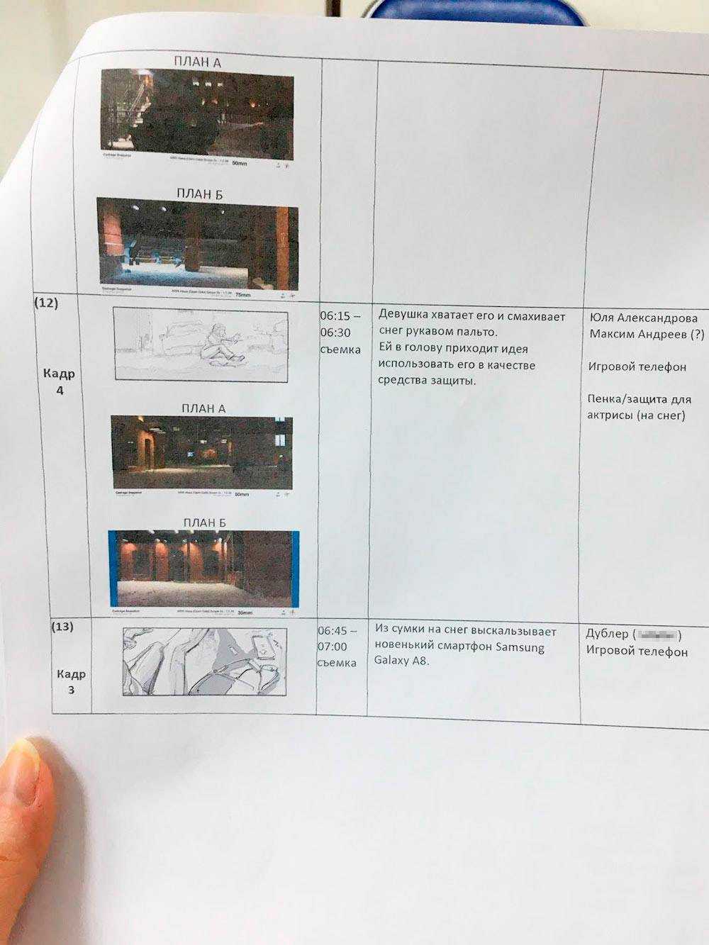 У меня осталась фотография части сценария рекламного ролика. Итоговые версии роликов сильно укоротили, многое из отснятого в них не попало