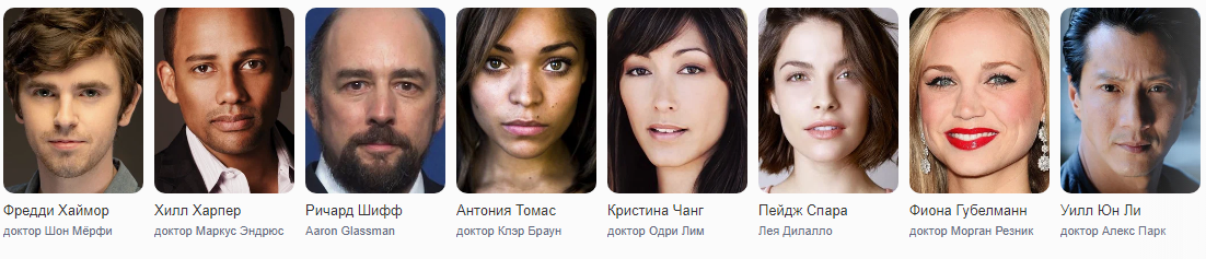 - Фредди Хаймор в роли доктора Шона Мерфи, аутичного ординатора хирургического отделения. Его савантные способности включают почти фотографическую память и способность замечать мельчайшие детали и изменения. Его прием на работу вызвал разногласия среди членов совета. В конце пятого сезона он женится на Леа Дилалло. В воспоминаниях о подростковом возрасте его изображает Грэм Верчер.