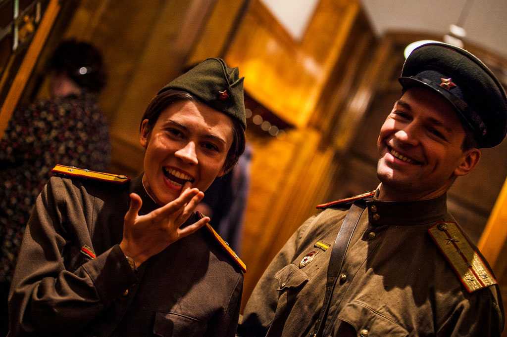 — В России практически ничего не сохранилось нетронутым, со времен войны все-таки прошло 70 лет, — поясняет режиссер. — Зато в Риге мы нашли прекрасную натуру. Железнодорожным вокзалом для нас послужил бывший аэропорт Спилве — сейчас он закрыт, но снимать там можно, его еще не ремонтировали с тех пор. И это не руины. Проблема в другом: у нас есть сцены у поезда, на платформе и внутри вокзала. Так что перрон мы снимали на вокзале в Бресте. И потом два объекта сводили в один: установили на брестском вокзале 30-метровый хромакей (зеленое полотно, на месте которого можно дорисовать любую натуру. — Авт.) и вот туда потом «впечатали» экстерьер Спилве. Приходилось рижских актеров, которые пробегали в кадре в Спилве, перевозить в Брест, чтобы поставить их потом на те же места во время съемки.