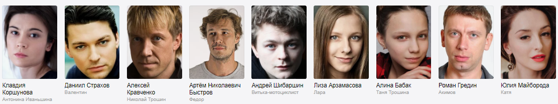 Актеры: Клавдия Коршунова, Даниил Страхов, Артём Быстров, Алексей Кравченко, Олег Васильков, Хельга Филиппова, Арина Шинкина, Елизавета Арзамасова, Валентина Мазунина, Алина Бабак, Роман Клабис, Ольга Волкова, Ирина Чериченко, Сергей Фролов, Александр Воробьёв, Людмила Князева, Вячеслав Чепурченко, Николай Мачульский, Василий Козлов. Полный актерский состав с фото приводится ниже.