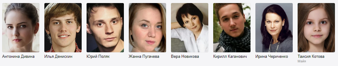 А также: Мария Гузеева, Сергей Паршин, Евгения Шибаева, Анна Мигицко, Станислав Толстов, Павел Стонт, Ирина Величкина, Павел Сергеев, Илья Анкудинов, Денис Шленков, Александра Власова, Татьяна Кульнева, Светлана Мерцалова