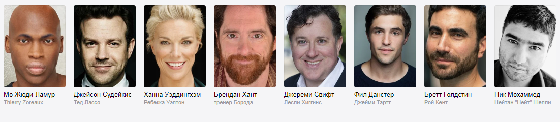Главного героя – американского тренера Теда Лассо, ставшего чуть ли не национальным героем Америки после выхода сериала, сыграл Джейсон Судейкис. Актеры, сыгравшие футболистов спортивного клуба «Ричмонд», представлены в таблице:
