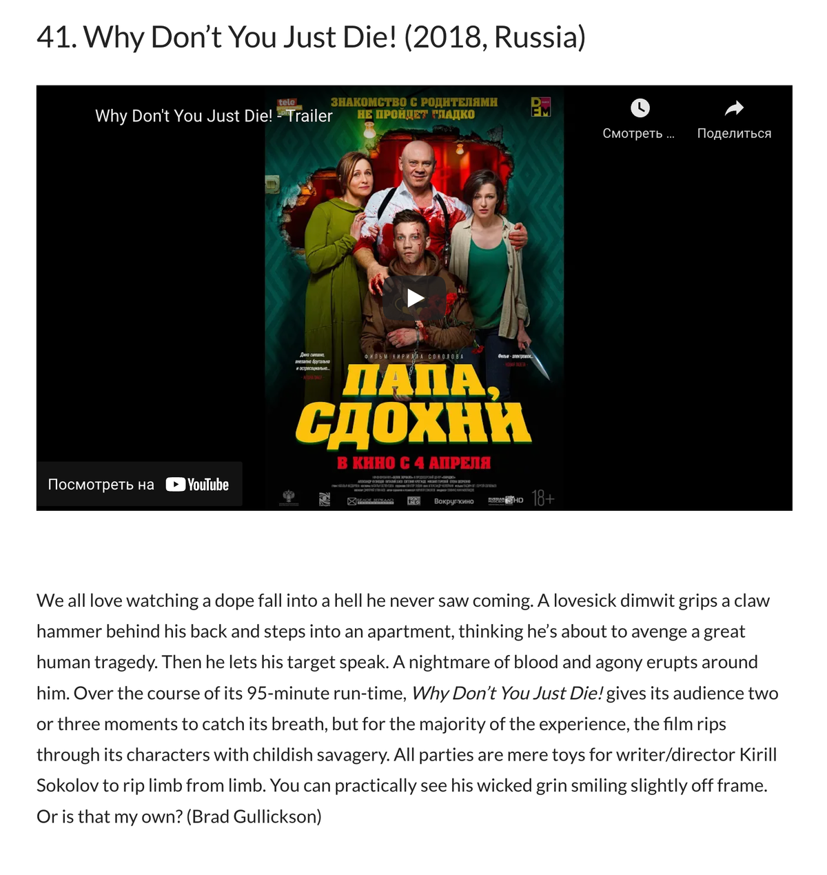 Сейчас у фильма рейтинг 97% на Rotten Tomatoes при 77 рецензиях, что немало для российской картины. Его хвалят все топовые издания: Variety, New York Times, LA Times, тот же The Hollywood Reporter. Недавно я смотрел по телевизору фильм «Мизери» по Стивену Кингу. И там главный герой, писатель, рассказывает: «Про меня Variety написали положительную статью!» Это для него как бы вершина творческой деятельности. А у меня такое и правда было.