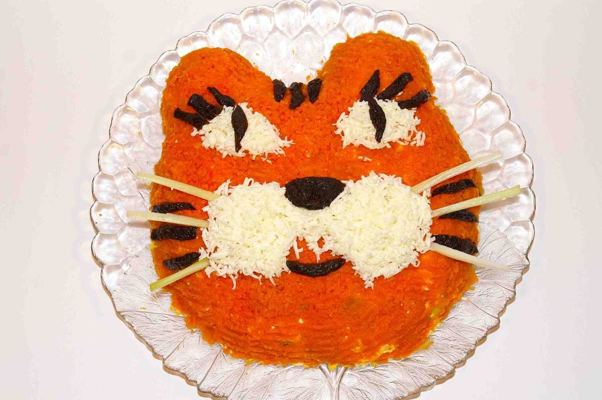 На Новый год 2022 стоит приготовить салат с очень интересным оформлением в виде головы тигра. Сделать такое блюдо можно быстро. Красная рыба в списке ингредиентов придает блюду неповторимый вкус.