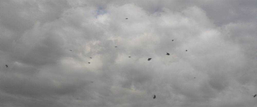 Выкручиваться пришлось и в другой сцене, в которой, по замыслу, по облачному небу должен был лететь косяк птиц. В исходниках у нас реальных таких кадров не было, поэтому режиссер нашел футаж — короткий видеоролик, сделанный специально для видеомонтажа. Футаж пасмурного неба, футаж птиц, текстура облаков, несколько часов работы в Adobe Premiere Pro — и кадр готов.