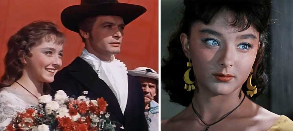 Анастасия Вертинская. Слева с Василием Лановым в фильме «Алые паруса». Справа в фильме «Человек-амфибия», 1961 год