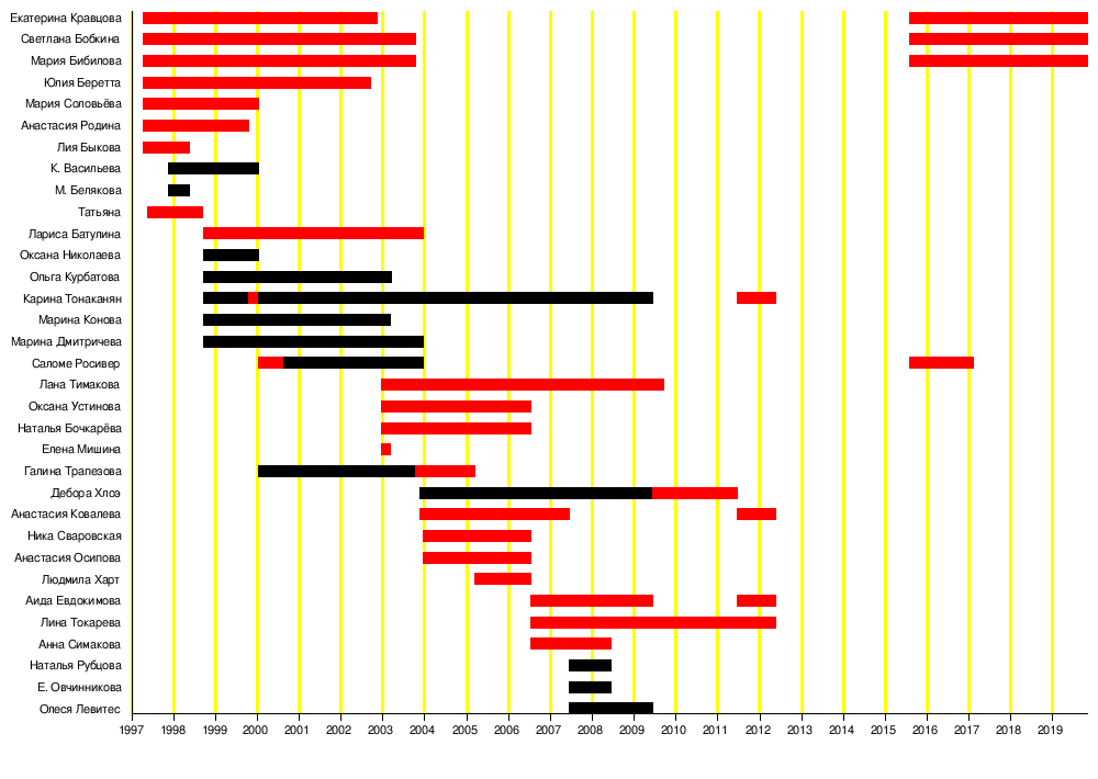 | 14. | 09.2006 — 2007 | Аида Евдокимова (Валиахмедова) | Лина Токарева | Анна Симакова | Людмила Харт | 09.2006 — 2007 | 14. | ||||||