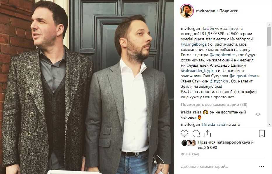 Кроме того, день назад Виторган сообщил, что 31 декабря он будет работать — актер примет участие в «БеспринцЫпных чтениях» Александра Цыпкина (не секрет, что Богомолов и Цыпкин после скандальной истории с Tatler — два противоположных лагеря).