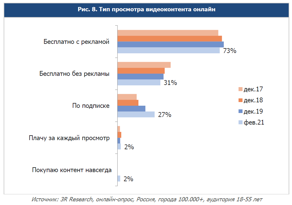 Три четверти опрошенных готовы терпеть рекламу, около трети используют торренты для скачивания видео (опция ответа «Бесплатно без рекламы»). Продолжает бурно расти подписка (27% респондентов заявили, что у них есть платный доступ к одному из видеосервисов). Впервые был задан вопрос о покупке контента «навсегда». В результате TVOD и EST показали идентичные результаты.