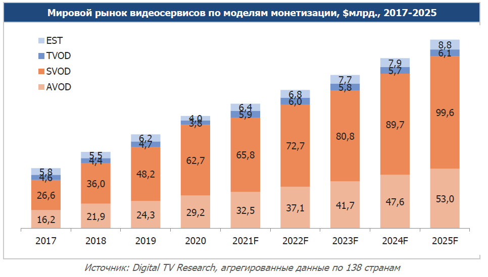 Как было отмечено, в отчетах за предыдущий год SVOD стала крупнейшим источником дохода мирового рынка легальных видеосервисов ещё в 2016 году, обогнав AVOD, а в 2017 году на подписную модель пришлась половина всей выручки отрасли. По прогнозу Digital TV Research 2025 году доходы от подписки вырастут почти на 60% относительно 2020 года и составят около $100 млрд.