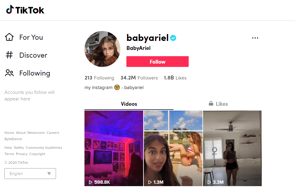 Бэйби Ариель (@babyariel). Девушка ведет каналы на тему красоты не только в ТикТоке, но и в Снэпчате, Инстаграме. На аккаунт Бэйби Ариель подписано больше 34 миллионов человек.