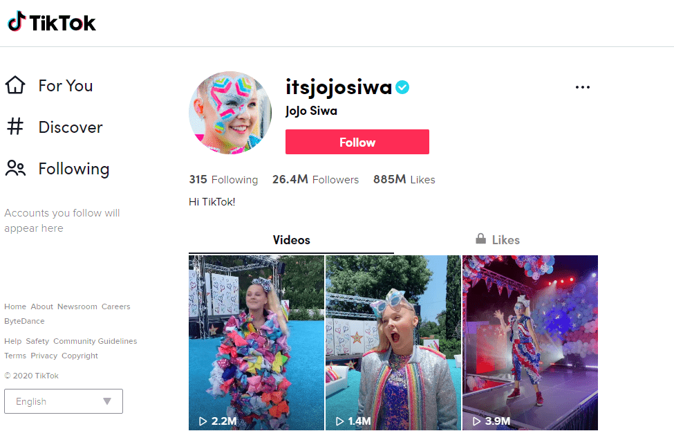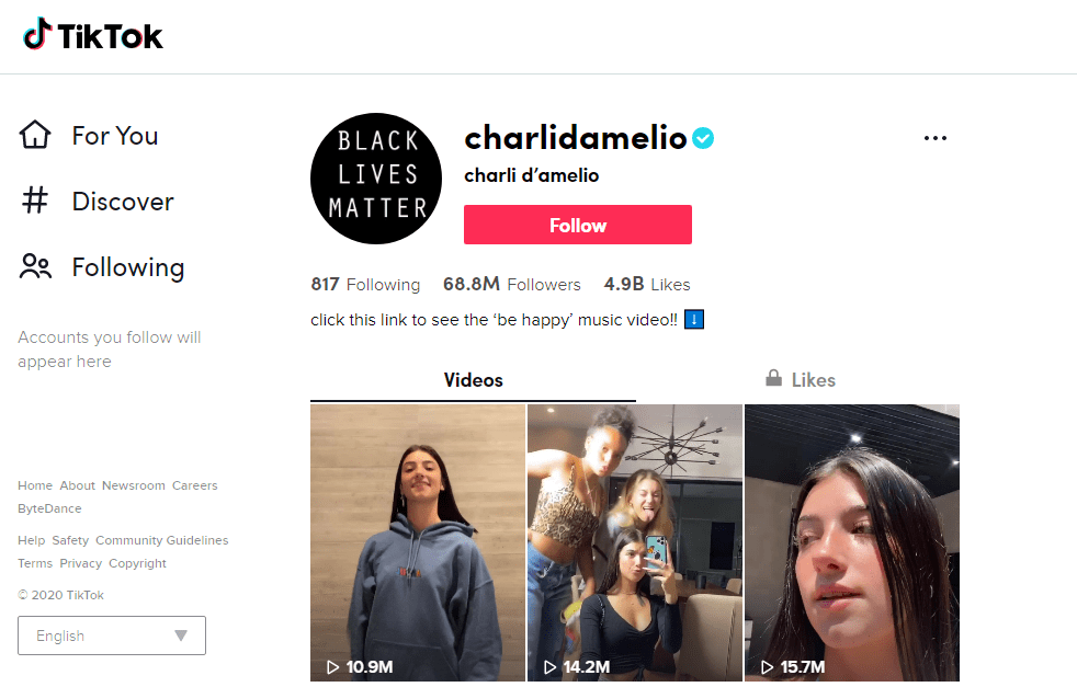 За кратчайшие сроки ее блог в Тик Ток набрал миллион зрителей, ее стали узнавать в университете и на улице. И на сегодняшний день она считается самым крупным контент-мейкером Тик Ток, поскольку на нее подписаны около 57 миллионов человек.