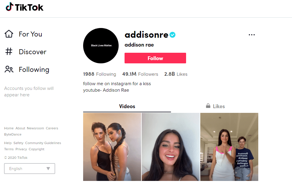 Эддисон Рэй (@addisonre). Эддисон стала известна не только как участница хайпхауса, собрания американских тиктокеров, но и как яркая, харизматичная девушка. Она регулярно снимает танцевальные трендовые ролики, которые набирают по несколько миллионов лайков. В топ звезд она попала с 49 миллионами подписчиков.