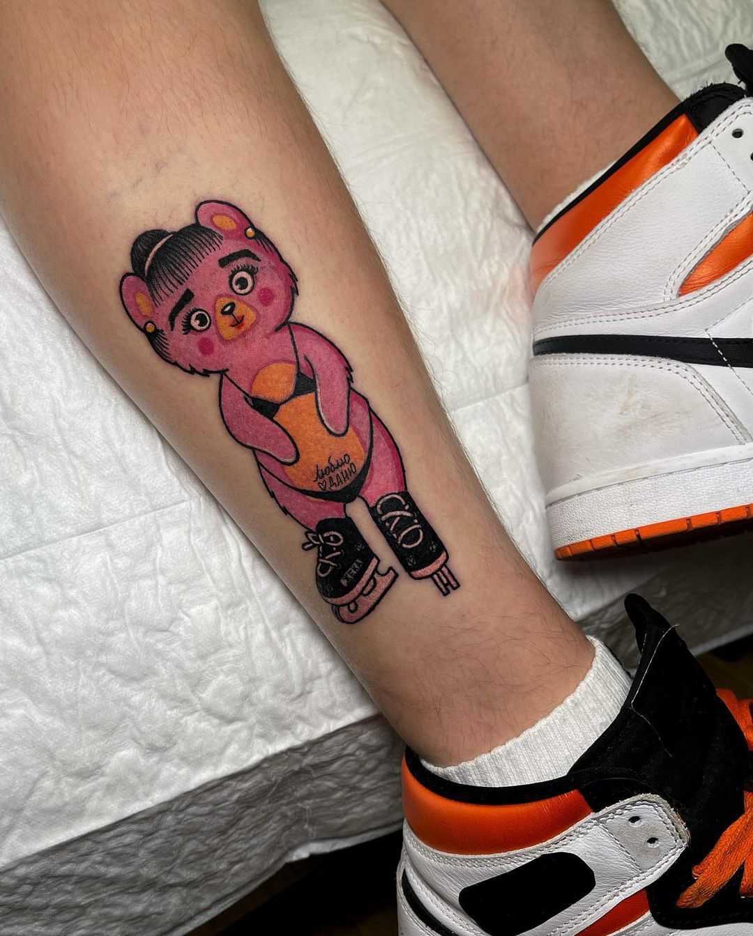 На коньках стоять непросто, не говоря уже о катании и выполнении элементов, но Милохин все быстро схватывает на лету — он уже делал гидроблейд, хоть и смазано. Да и видно, как сам Даня кайфует от процесса, от тренировок с Женей и того, что с ним происходит. Он сделал татуировку на ноге: розовый медвежонок, на животе которого надпись “Люблю Даню”, а на ботинке конька — “Жека”.