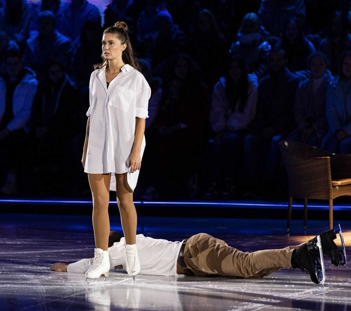 Энберт и Муцениеце катались под композицию Елены Ваенги «Гравитация». На актрисе была нежно-розовая рубашка и чёрные шорты, а на фигуристе – белая кофта и бежевые брюки. Александр несколько раз поднимал партнёршу в красивые поддержки, заставляя публику охать от восторга.