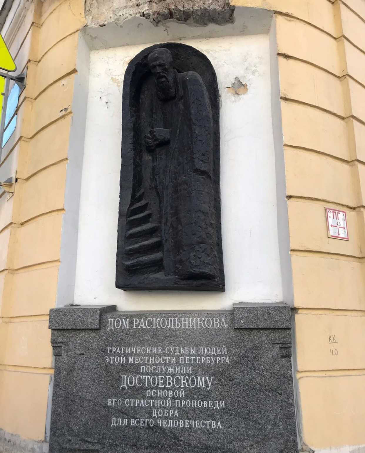 Представлениям о мрачном Петербурге мы можем быть благодарны писателю Федору Достоевскому. Своей жилплощади у писателя никогда не было, поэтому он постоянно переезжал и менял адреса съемных квартир. Но мы точно знаем один важный дом в его творчестве – это дом Родиона Раскольникова, героя романа «Преступление и наказание». В большой доме с множеством мелких квартир, населенных купцами и ремесленниками, Раскольников снимал крохотную комнату прямо под крышей. В память о великом русском писателе на фасаде угловой части здания установлен горельеф с изображением Достоевского. Под ней размещена мемориальная плита с надписью – «Трагические судьбы людей этой местности Петербурга послужили Достоевскому основой его страстной проповеди добра для всего человечества».