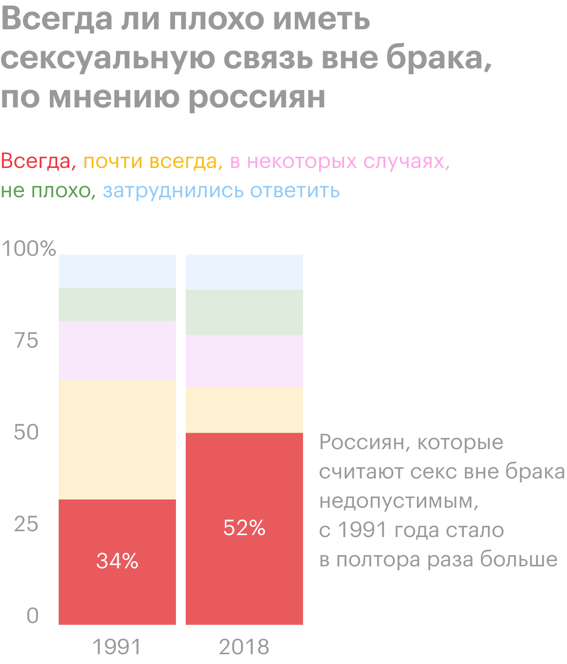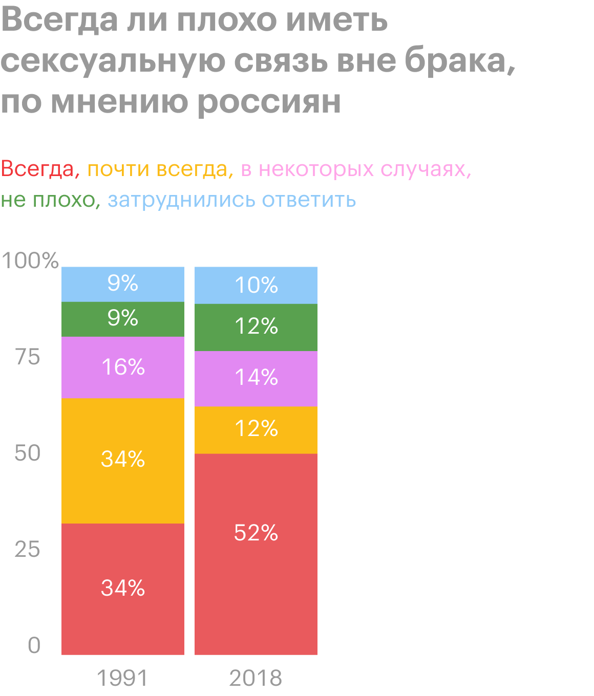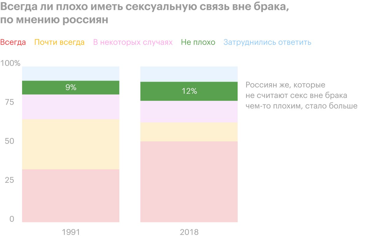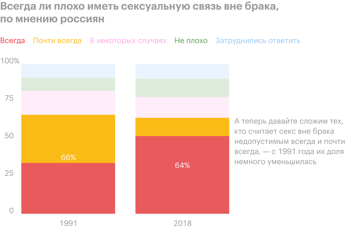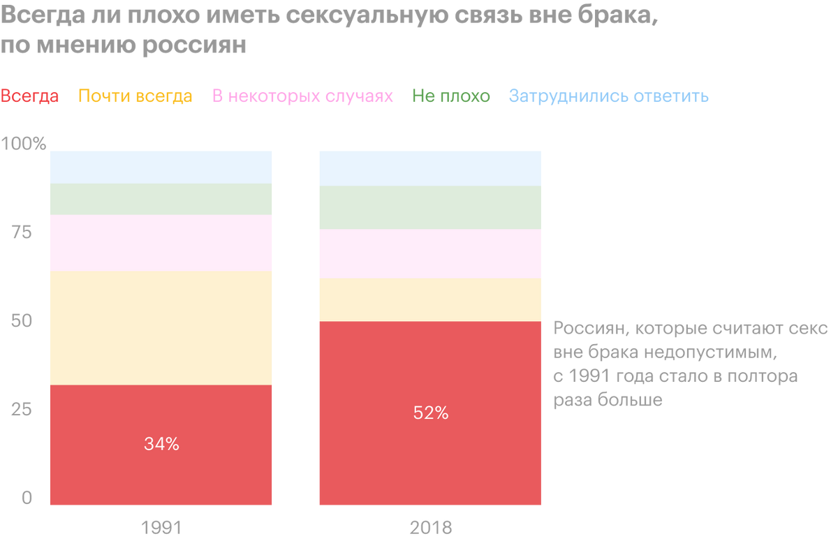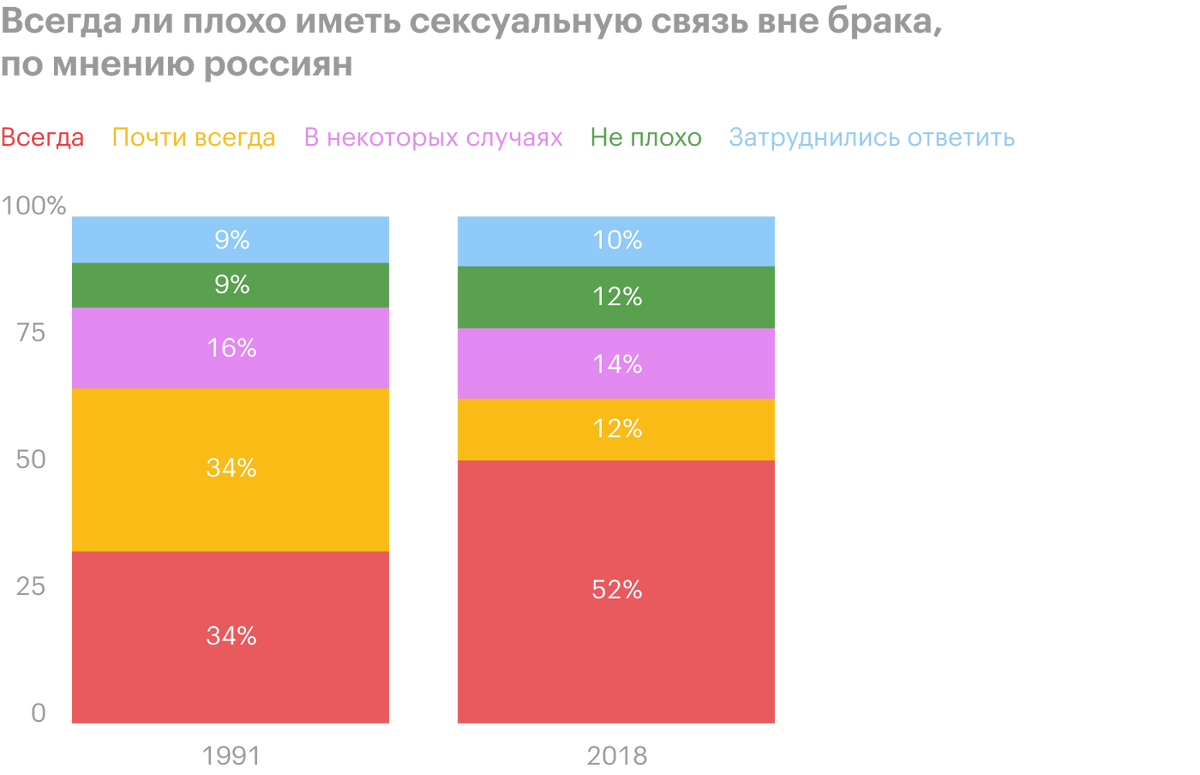 Что касается измены в браке, то, если верить другому исследованию, больше половины россиян считают это достойным осуждения. И только 12% опрошенных сказали, что в этом нет ничего предосудительного. Причем, если верить соцопросам, доля тех, кто категорически осуждает секс на стороне, за 30 лет выросла почти в полтора раза — с 35 до 52%.