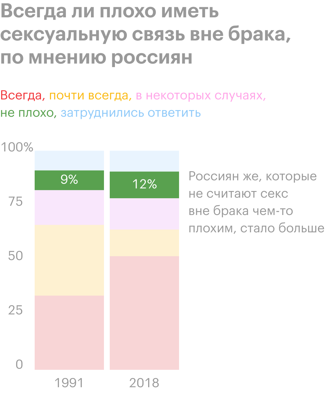 Количество людей, утверждающих, что в измене нет ничего страшного, тоже выросло, но несущественно: с 9% в 1991 году до 12% в 2018.