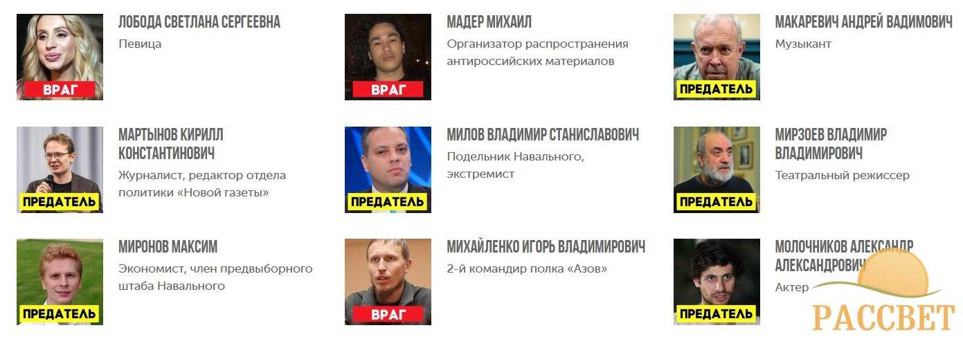 В Сети заработал сайт под названием «Предатели», который был открыт Комитетом защиты национальных интересов РФ. На ресурсе собраны «враги», «предатели», а так же «трусы» и «беглецы», которые выступили против спецоперации на Украине.